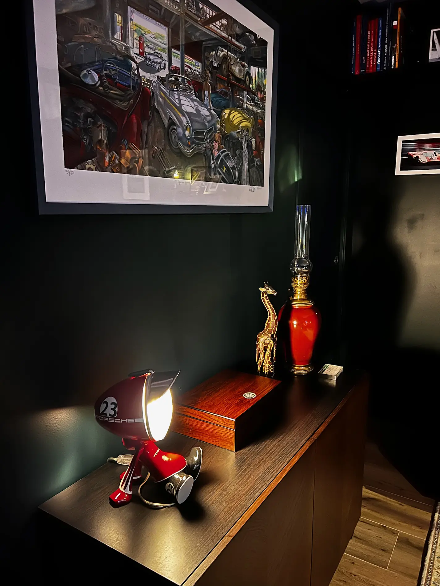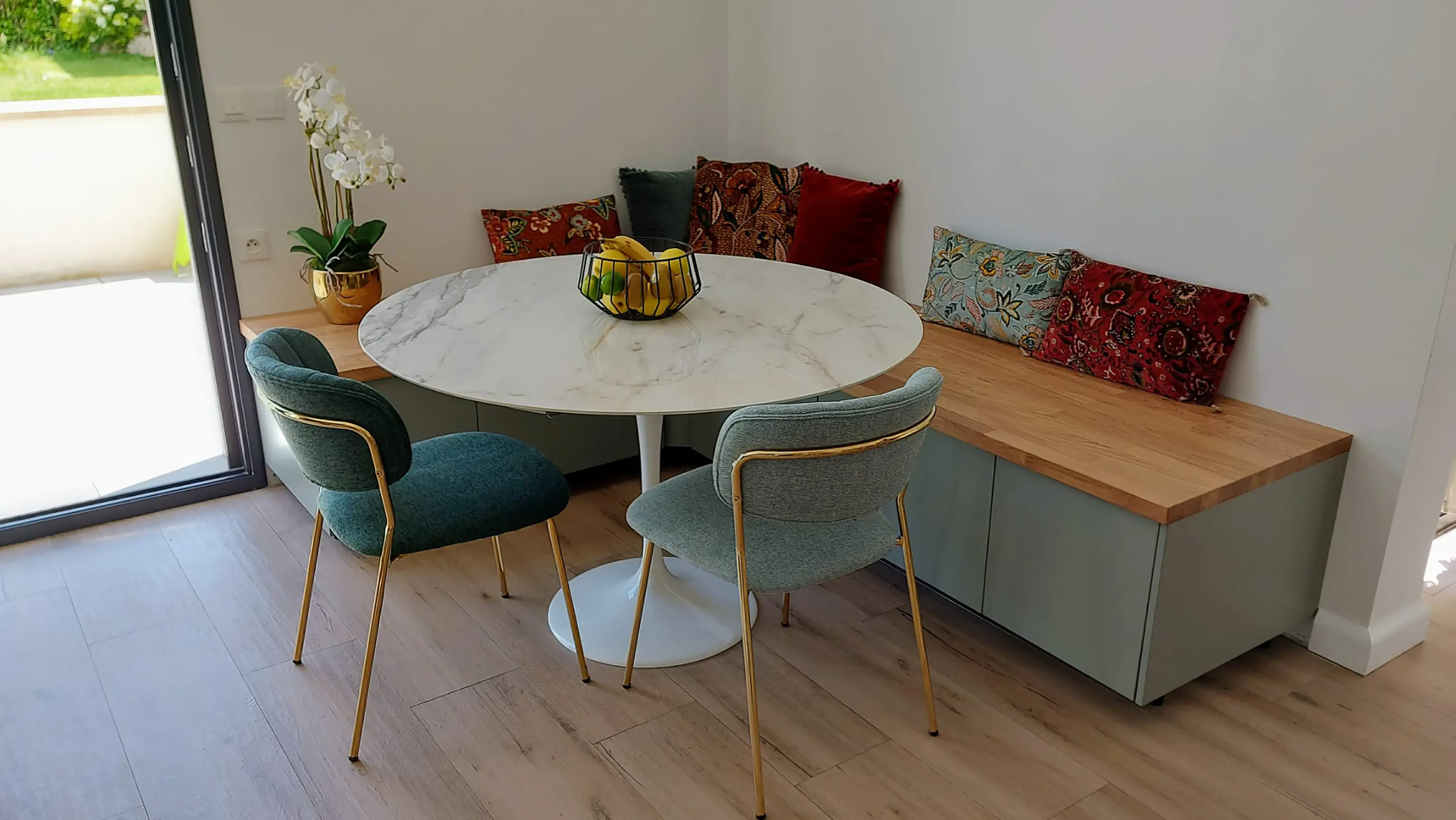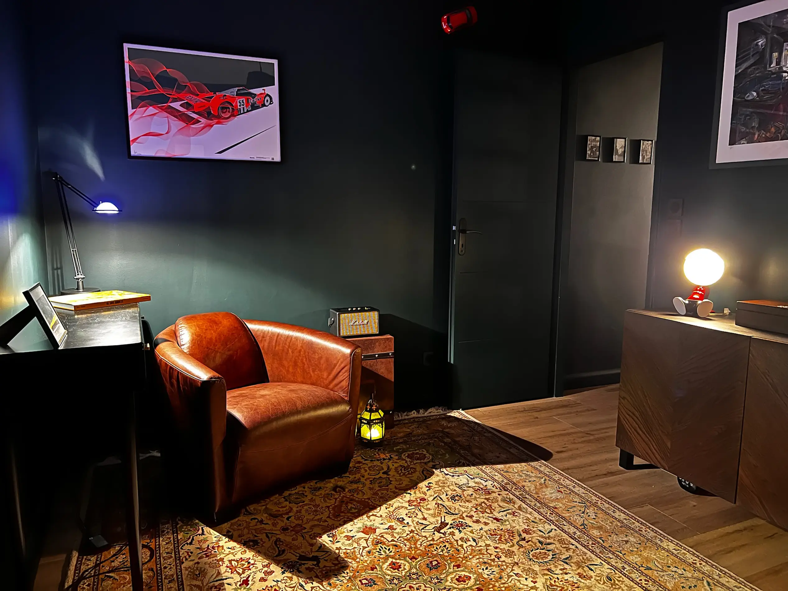 Le coin salle à manger a été optimisé avec une banquette et des chaises, ainsi qu’une table en marbre extensible avec un pied tulipe pour recevoir plus d’invités. Dans la chambre boudoir, qui devait initialement être un coin pour Jérôme, nous avons intégré des éléments personnels et opté pour un vert forêt foncé pour un style détente et cocooning, avec une touche club cigare. Ce même vert a été utilisé dans le couloir et l’entrée pour créer un fil conducteur à travers la maison.
