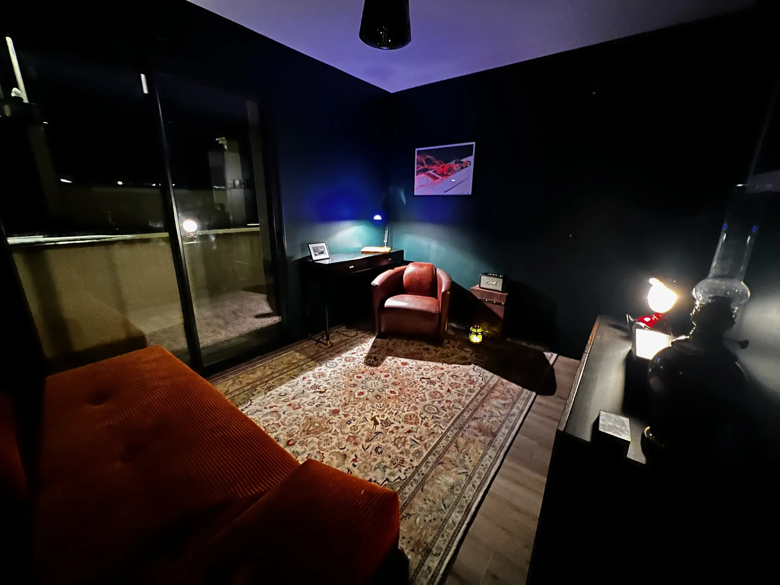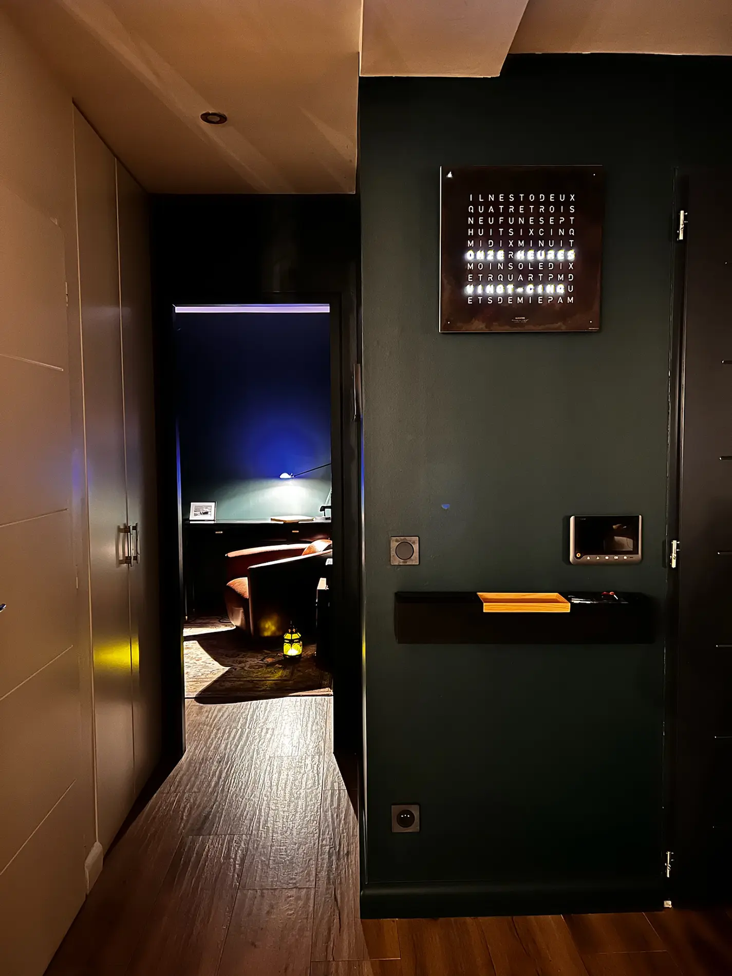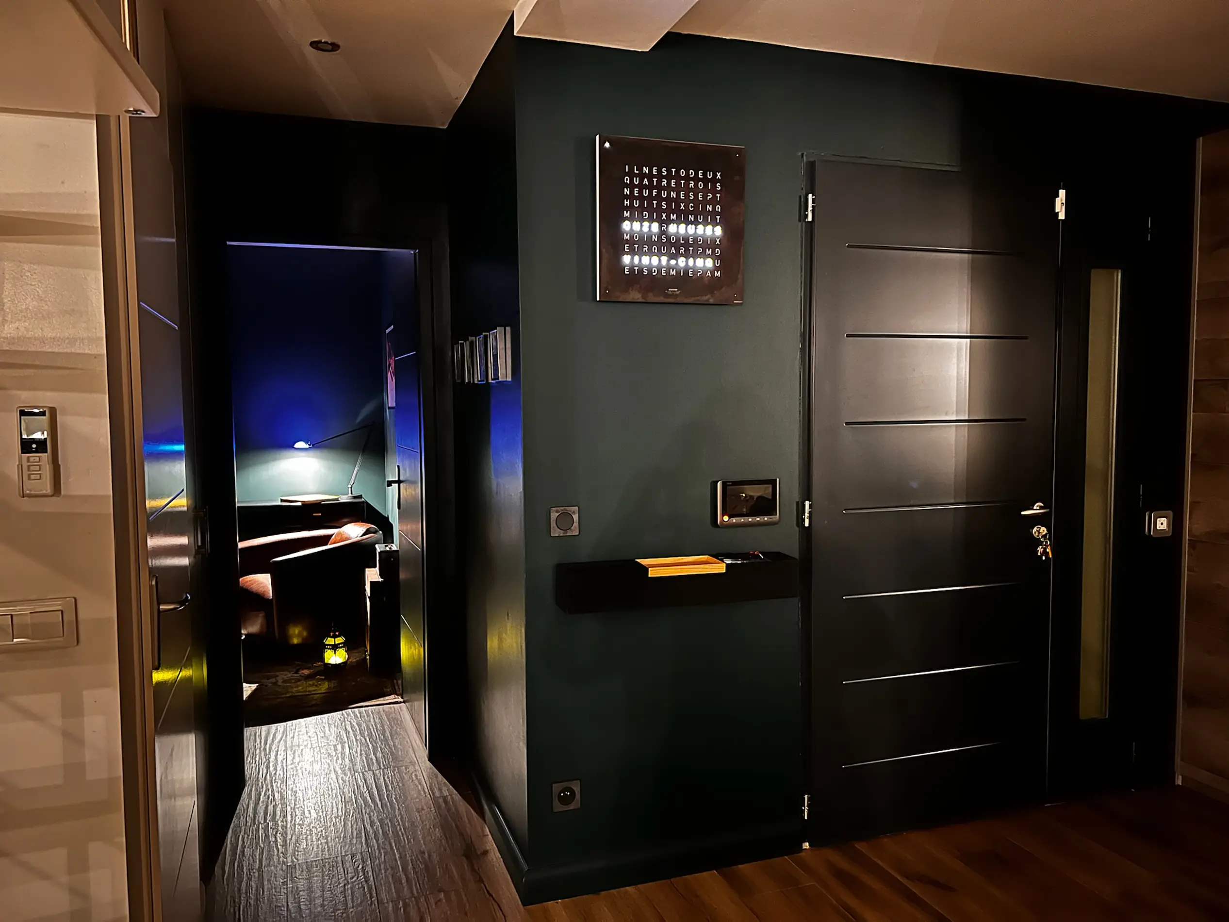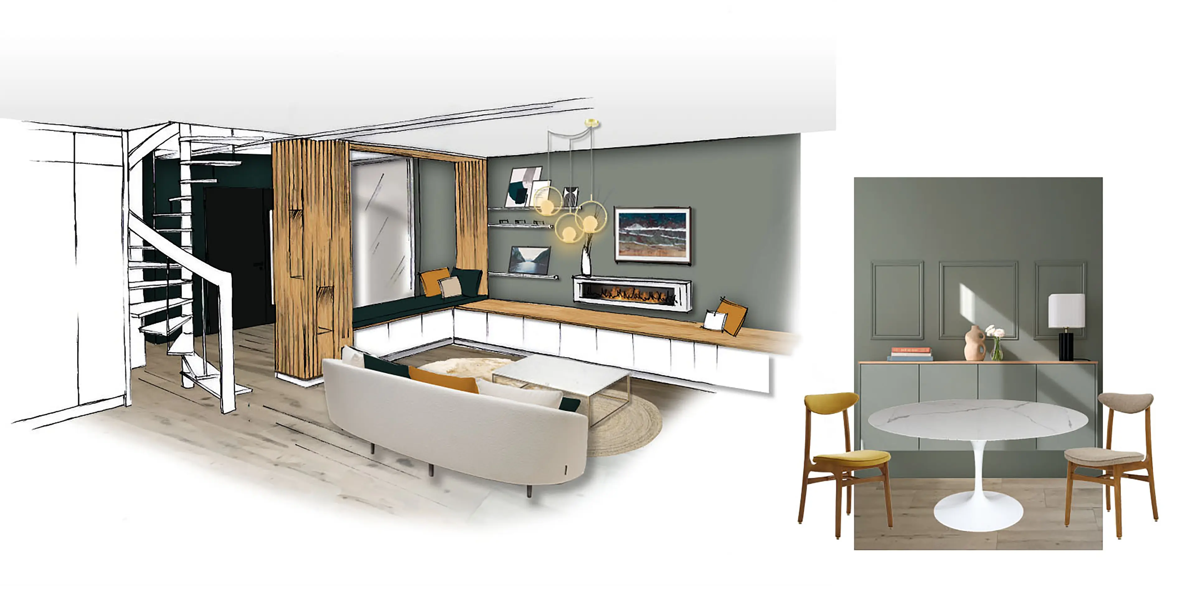 Le coin salle à manger a été optimisé avec une banquette et des chaises, ainsi qu’une table en marbre extensible avec un pied tulipe pour recevoir plus d’invités. Dans la chambre boudoir, qui devait initialement être un coin pour Jérôme, nous avons intégré des éléments personnels et opté pour un vert forêt foncé pour un style détente et cocooning, avec une touche club cigare. Ce même vert a été utilisé dans le couloir et l’entrée pour créer un fil conducteur à travers la maison.